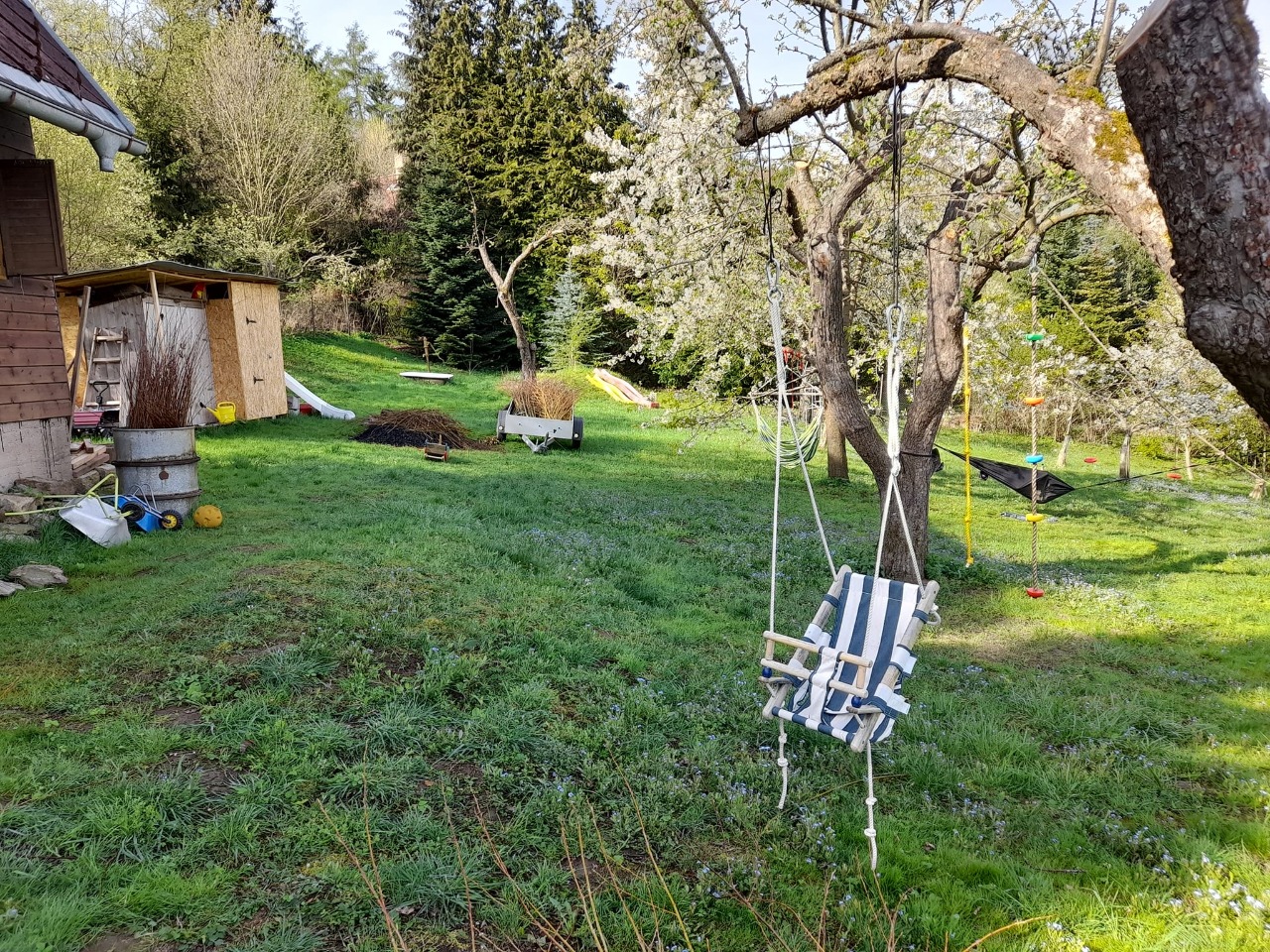 Napravo houpačka pro naše nejmenší. Za ní pak už provazy pro ty starší. Na káře vrbové proutí, ze kterého budou záhonky. V boudě nalevo je zahradnické náčiní, které je volně dostupné dětem. Před boudou máme ohniště.
