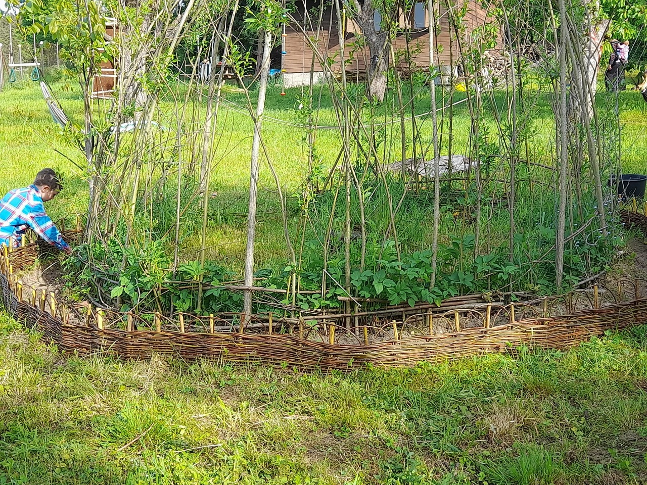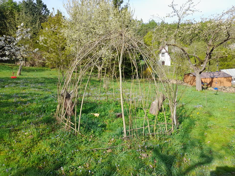 Vrbová jurta byla postavena společně s dětmi při víkendovce. Zakořenila a obrůstá. Příští rok ji převážeme a dáme jí ještě hezčí tvar. Mimo to je kolem ní udělaný záhonek s hráškem, který dětem zajistí stín a zdravé mlsání.