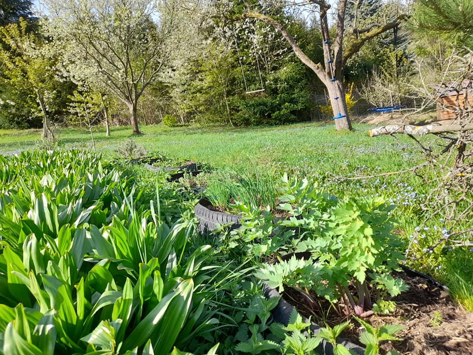 Bylinkové záhonky (libeček, pažitka, máta, meduňka, šalvěj, levandule, oregano, tymián, řepík) - vše mohou děti dle libosti ochutnávat a očichávat. Zatím v pneu, později zde bude rozsáhlý proutěný záhonek.