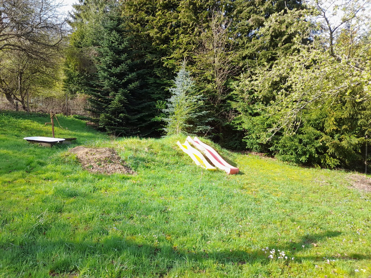 S terénem splývají skluzavky, další dvě máme zazimované (jedna pro odvážnější, druhá pro ty nejmenší). Nalevo je nefunkční pumpa a v rohu kompost.
