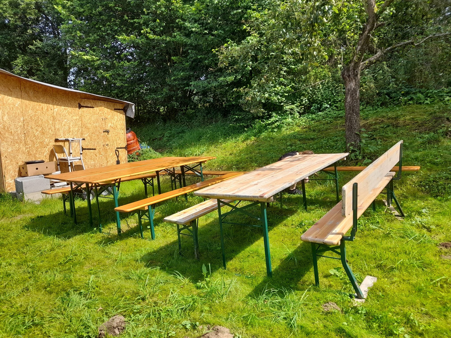 Hromada dříví je z ořezu ovocných stromů. Věříme, že po desítkách let, kdy se na zahradě nedělalo vůbec nic, začnou stromy znovu plodit. Nalevo pod modrou plachtou je pískoviště, které tvořily děti minulý rok při táboře. Nalevo od pískoviště sice není vidět, ale je tam dětmi oblíbené blátoviště.