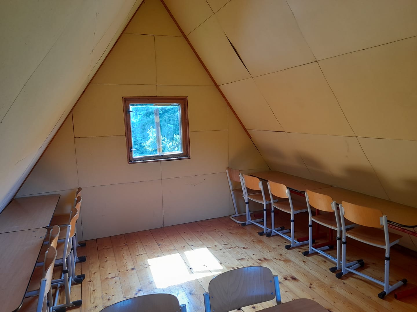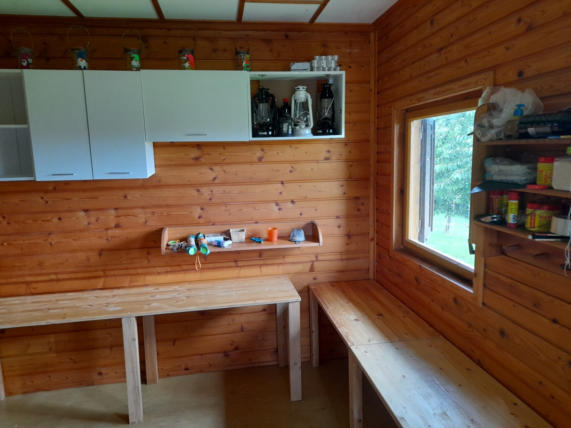 Chata pro vnitřní setkávání. Máme tu kuchyňku, výukovou místnost a odpočinkovou místnost. A opravdu spoustu materiálu na tvoření a bádání.