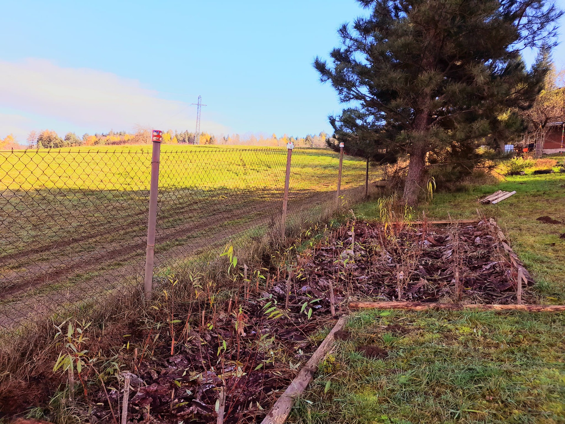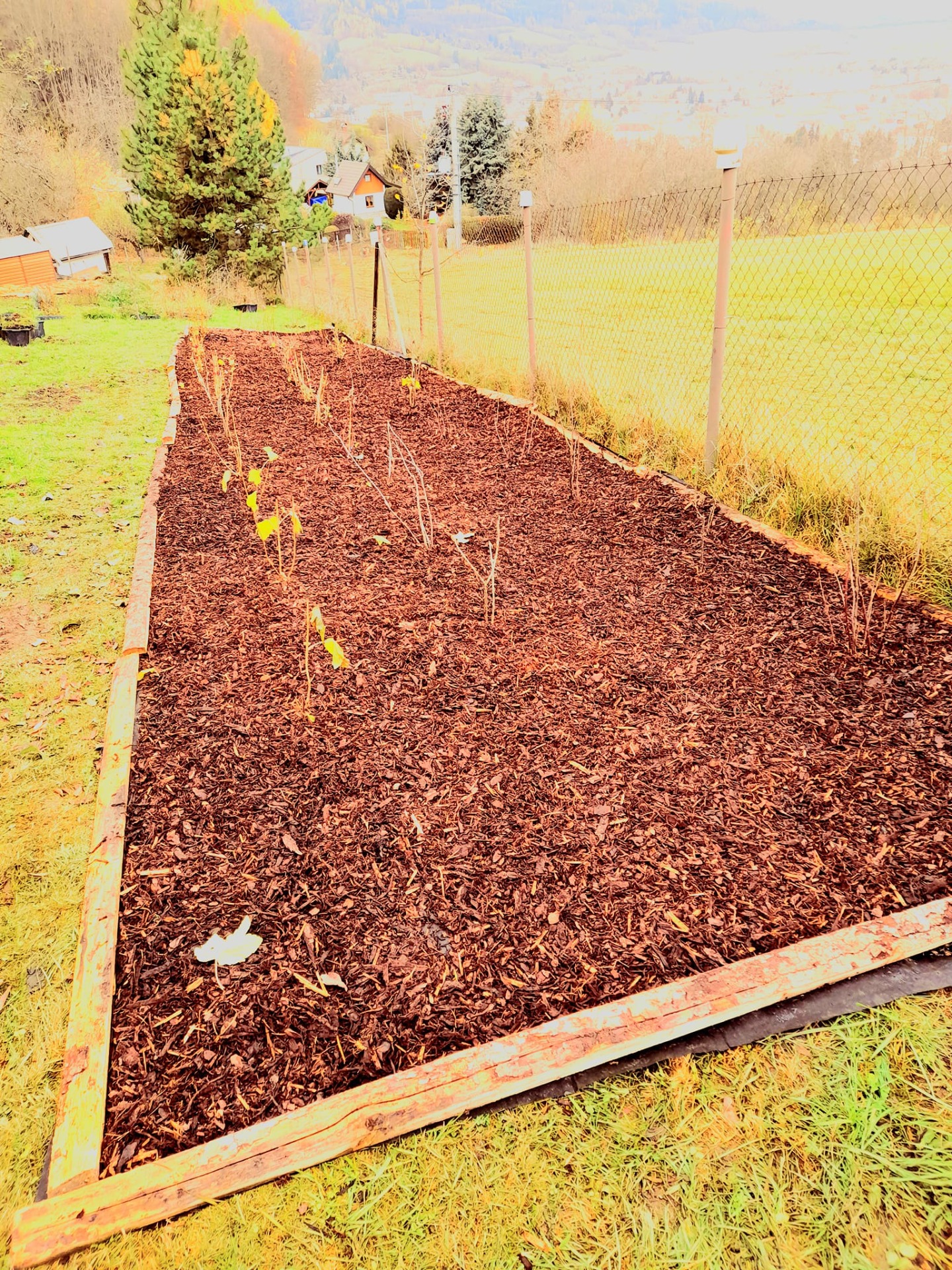 Až k borovici je řada ovocných keříků (rybízy /bílé, červené, černé/, angrešty, borůvky). Sami si z nich namnožíme další keříky, které vysadíme do sadu napřesrok. Po zahradě je ještě několik koutků s malinami, jostami a ostružinami.